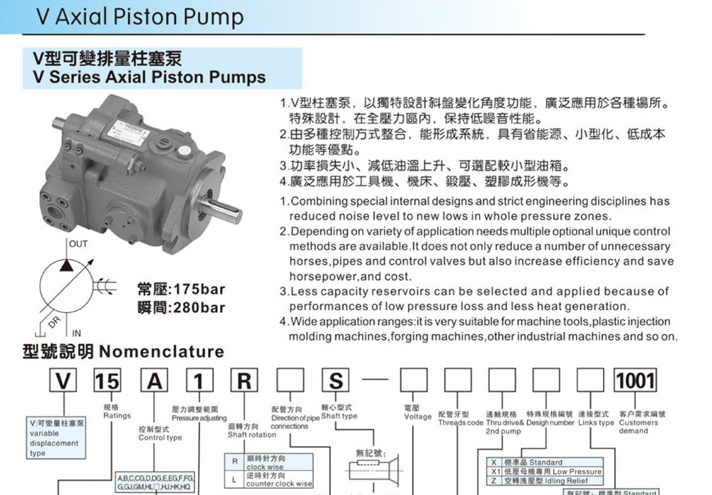 1、V型柱塞泵,以獨特設計斜盤變化角度功能。廣泛應用于各種場所。特殊設計,在全壓力區(qū)內,保持低噪音性能。